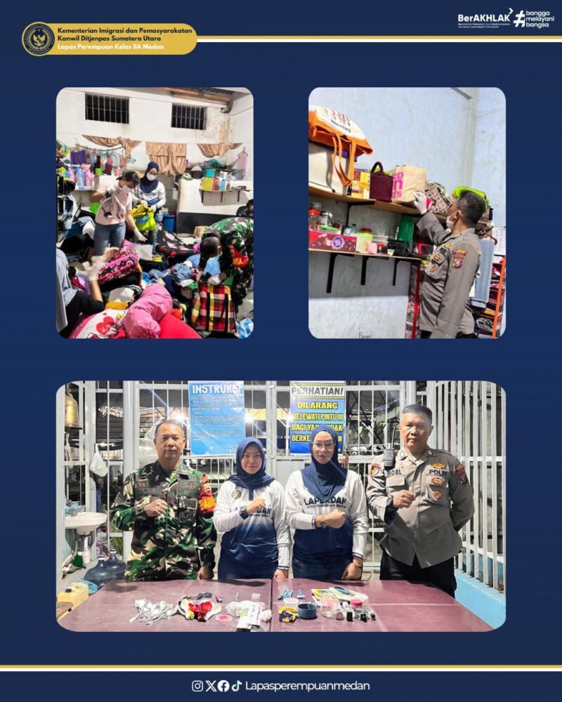 Medan – Dalam rangka menindaklanjuti instruksi Menteri Imigrasi dan Pemasyarakatan serta arahan Direktur Jenderal Pemasyarakatan tentang pelaksanaan razia bersama aparat penegak hukum, Lapas Perempuan Kelas IIA Medan melaksanakan razia rutin kamar hunian warga binaan pada Jumat malam, 10 Oktober 2025, pukul 23.00 WIB s.d. selesai. Kegiatan dipimpin oleh Kepala Kesatuan Pengamanan Lapas, Sepriana Putri, dan Kepala Seksi Keamanan dan Ketertiban, Fice Parlina, dengan dukungan personel Polsek Helvetia dan Koramil 06/Sunggal.